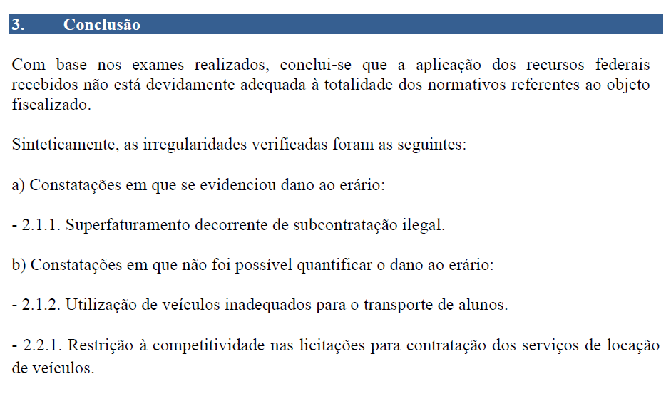 O relatório de fiscalização da Controladoria-Geral da União (CGU) apontou um prejuízo de R$ 385.327,41 ao erário