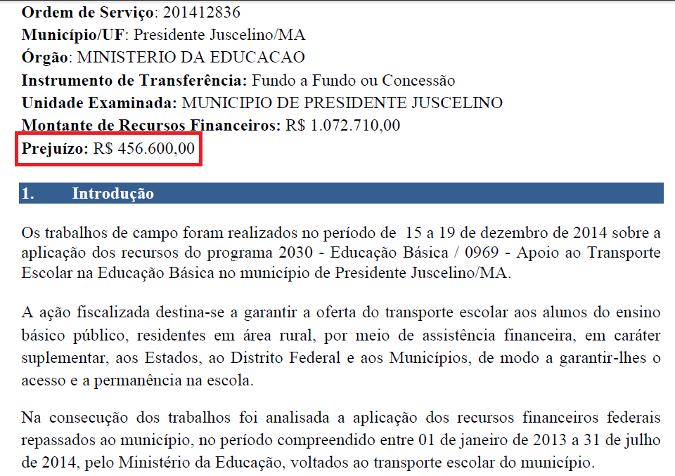 As ações de fiscalização da Controladoria-Geral da União (CGU) no Município de Presidente Juscelino apontaram um prejuízo