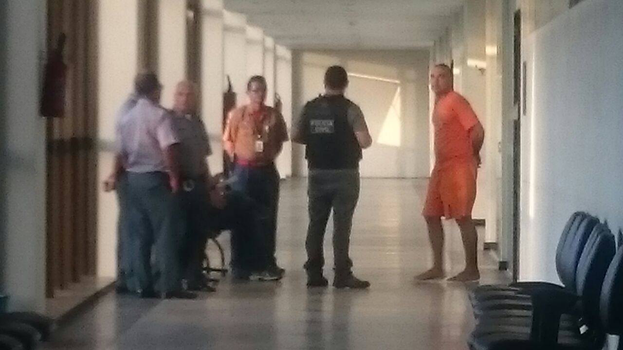 Lucas compareceu à audiência de custodia acompanhado de agentes penitenciários, conforme mostra a imagem acima. Ele tentou na audiência juntamente com o advogado de defesa se explicar para tentar o relaxamento da prisão, mas não foi convincente.