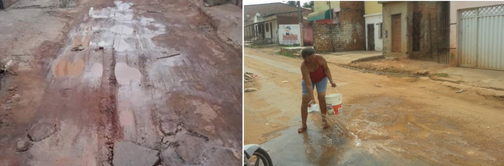 A situação foi registrada pelo internauta Tayson Rocha. “Obra mal feita de esgoto e encanação quebrada”, afirmou. A falta de pavimentação, nesta e em outras ruas do bairro, causa indignação na comunidade, já que a poeira além de deixar as casas bastante sujas, oferece riscos à saúde.
