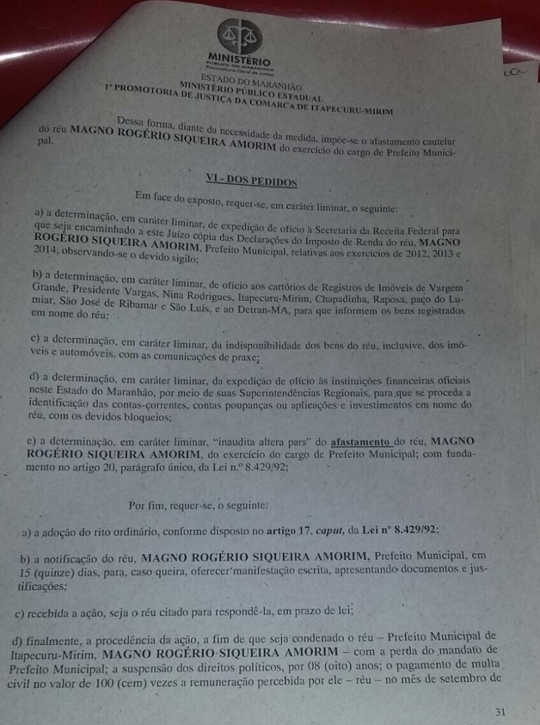 O Ministério Público (MP) do Maranhão pediu quinta-feira (01) o afastamento do prefeito de Itapecuru, Magno Rogerio Siqueira Amorim (PPS). O gestor é acusado de improbidade administrativa cometida nos processos licitatórios.