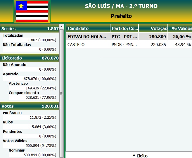Precisamente 60,720 mil votos fizeram a diferença na eleição para prefeito de São Luís, e deu a vitória ao candidato Edivaldo Holanda Júnior, do PTC, sobre o prefeito e candidato à reeleição, João Castelo (PSDB).