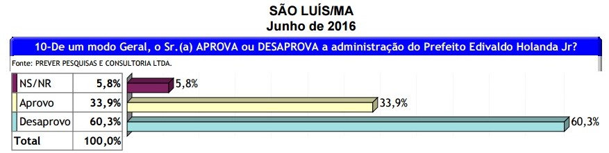 Conforme revelou a sondagem 60% desaprovam o governo municipal e apenas 33% do eleitorado da capital maranhense concordam que Edivaldo Holanda Júnior está fazendo uma administração. Não souberam ou não responderam apareceram com 5,8%.
