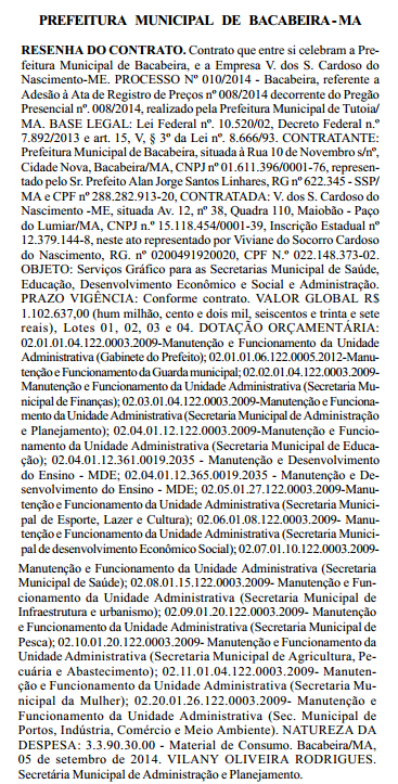 A empresa V.dos S. Cardoso do Nascimento-ME, receberá uma “pequena” quantia de R$ 1.102.637,00 (hum milhão, cento e dois mil, seiscentos e trinta e sete reais) para serviços gráfico para a secretaria municipal de saúde, educação, desenvolvimento econômico e social e administração.