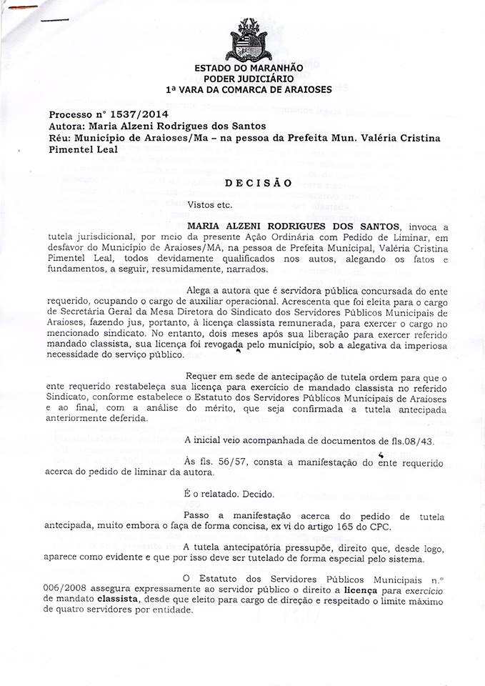 Ação que visava tão somente perseguir a servidora pública Alzenir Rodrigues e tentar enfraquecer o Sindicato dos Servidores Públicos de Araioses – SINDSEPMA foi articulada pelo governo de Valeria do Manin em outubro de 2014. Tal ação gerou uma série de transtornos de ordem moral e financeira à funcionária pública e a entidade.