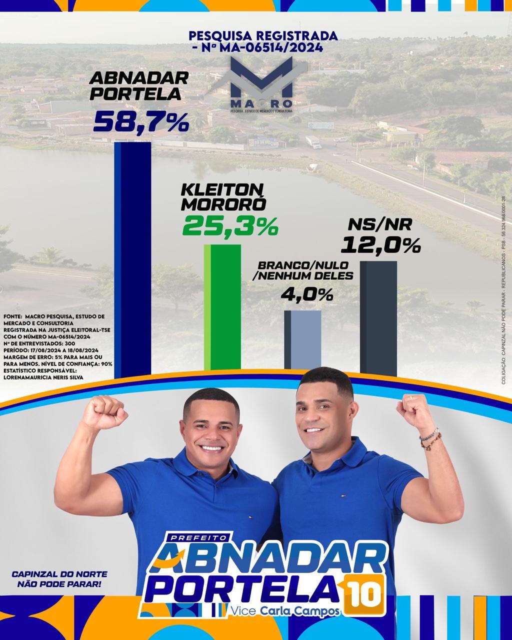 Segundo dados do Instituto Macro Pesquisa e Consultoria, Abnadar Portela detém 58,7% das intenções de votos dos eleitores, contra 25,3% Kleiton Mororó.