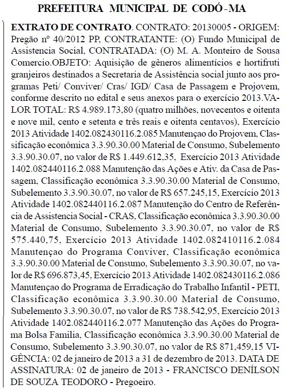 De número 2013005/, o extrato publicado do Diário Oficial do Estado diz que o valor refere-se a aquisição de gêneros alimentícios e hortifrutigranjeiros destinados a Secretaria de Assistência Social. Um absurdo!