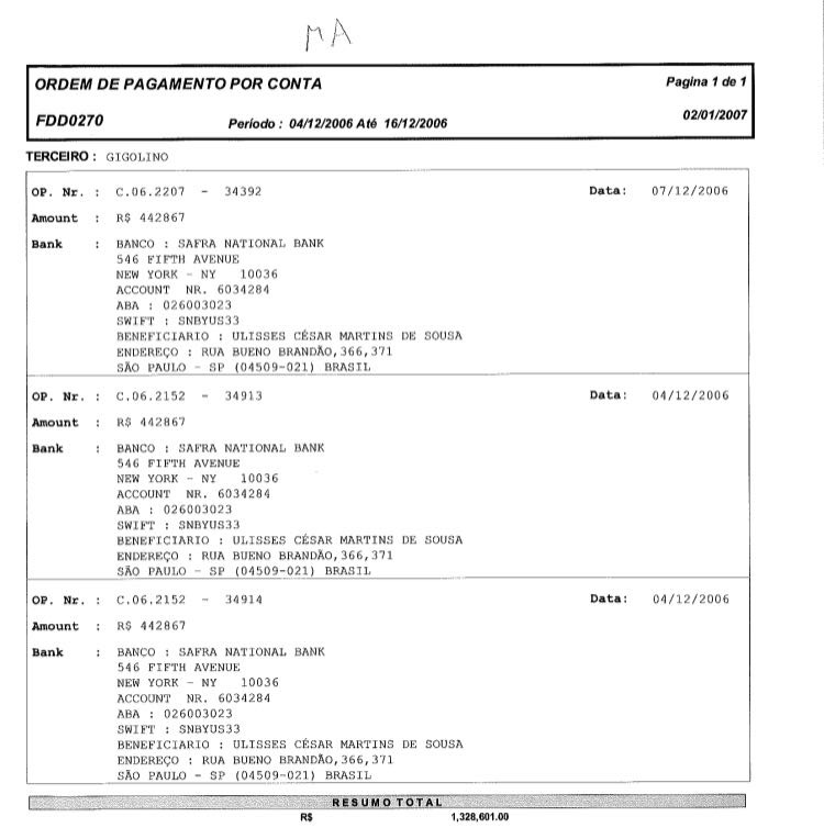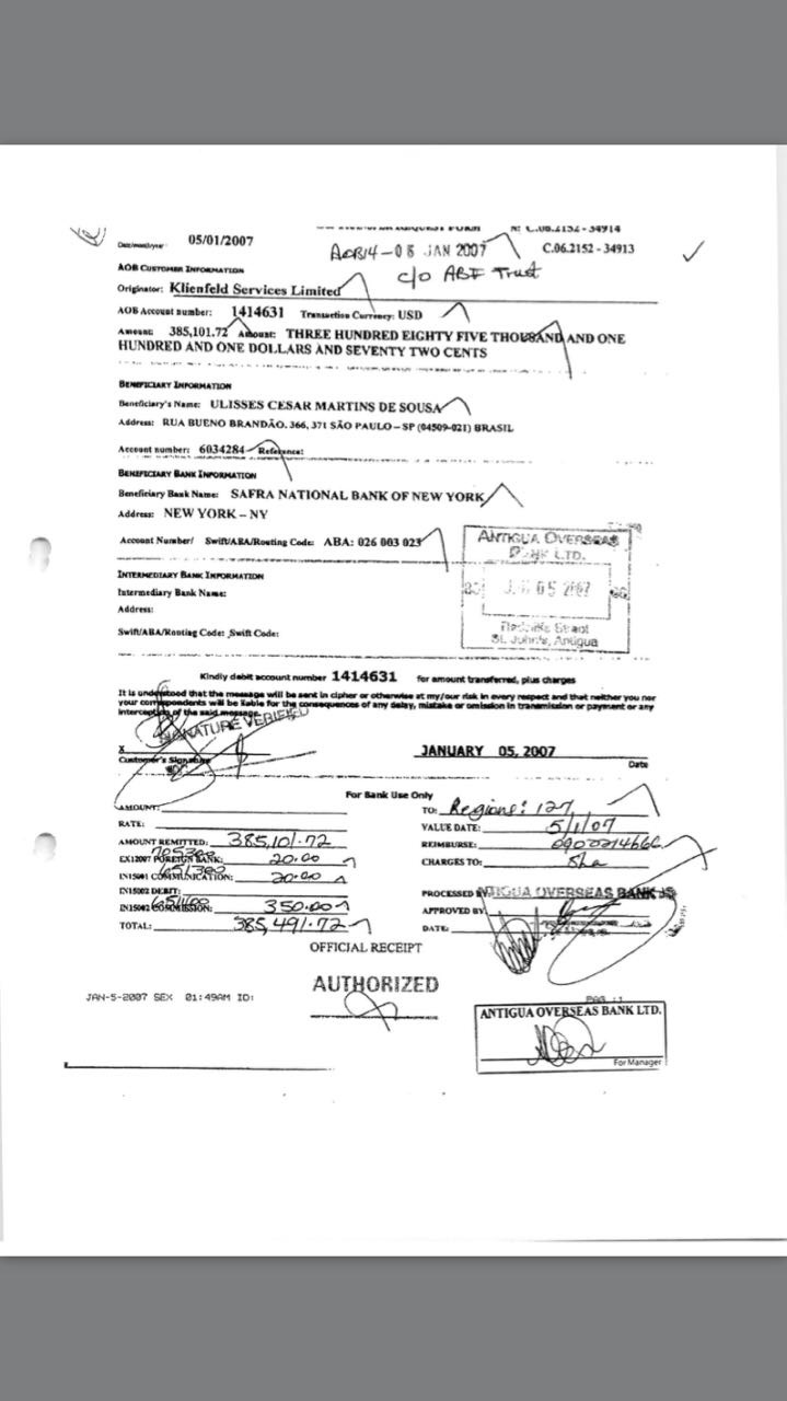Foram pagos US$ 385 dólares e US$ 192, que totalizam mais de R$ 1 milhão de reais, sendo que as transferências realizadas são de 2007. O pagamento fez parte de um acordo de atuação de Ulisses em favor da empresa que cobrava do estado milhões relativos a precatórios.