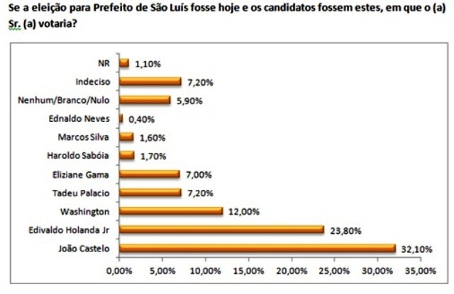 32,10% foi obtido por Castelo, em seguida, Holanda Jr., tem 23,80%, e Washington aparece com 12%. Ou seja, estatísticas que confundem a cabeça e manipulam o eleitor ludovicense.