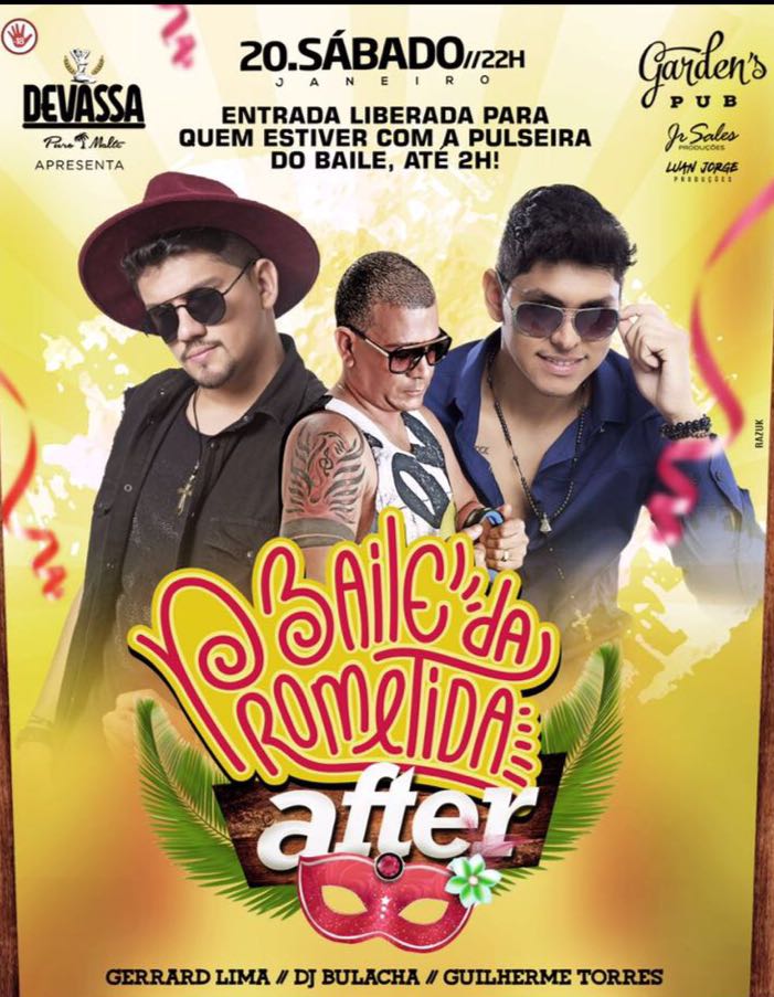 A festa vai acontecer na Gardens Pub e estará sob o comando dos cantores Gerrad Lima e Guilherme Torres. Quem estiver com a pulseira do baile terá entrada liberada até 2h da madrugada.
