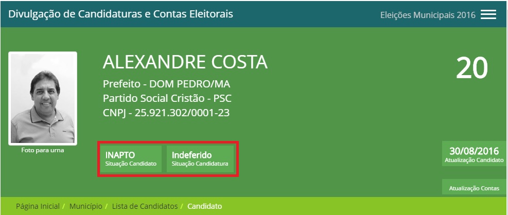 O ex-vereador e candidato a prefeito de Dom Pedro, Alexandre Costa (PSC), enganou seus eleitores e apoiadores financeiros de campanha sustentando por meses uma falsa candidatura. Com vários processos na justiça Alexandre é ficha suja e teve sua candidatura impugnada na última quarta-feira, nos processos Nº 27992 e Nº 28077 de inciativa do Ministério Público Estadual e da Coligação “Dom Pedro para todos”.