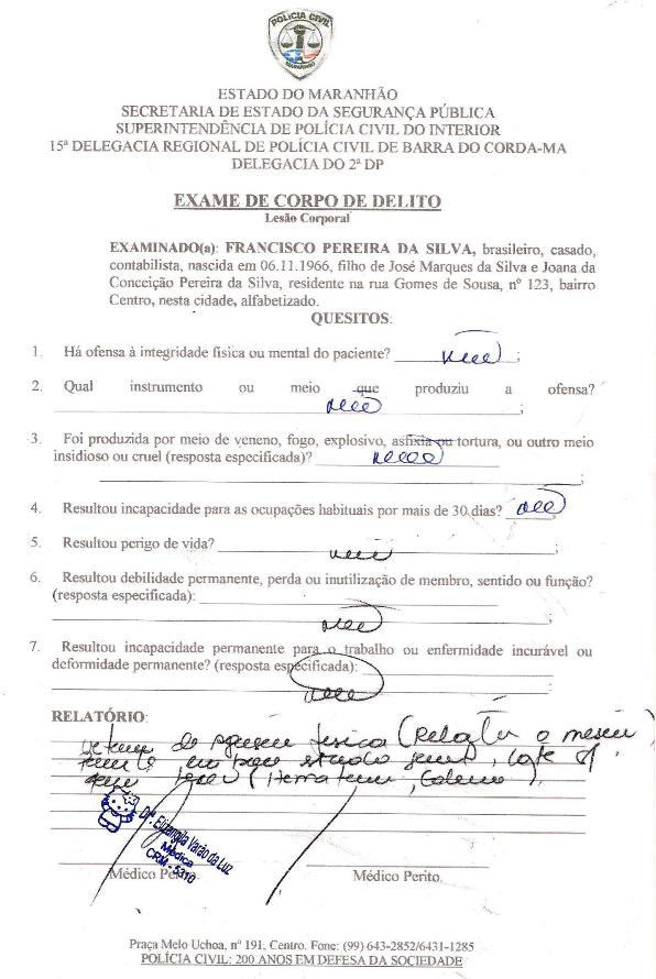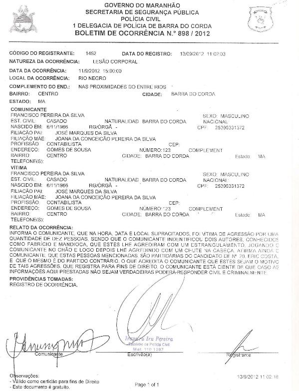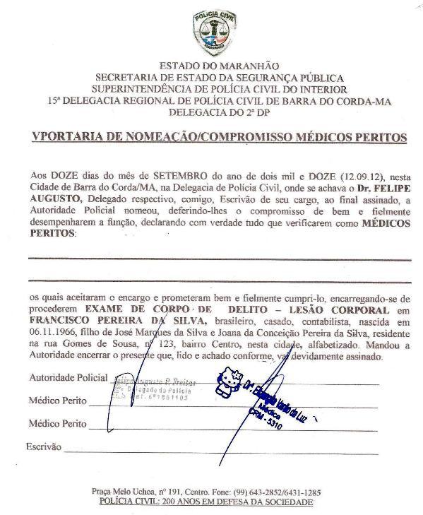 A denúncia foi anexada a um boletim de ocorrência, registrado no dia 13 deste mês na Delegacia de Polícia de Barra do Corda, sob número 8989/2012, e de um exame de corpo e delito, assinado pela doutora Elisângila Varão da Luz, comprovando a agressão.  Também foram encaminhados vídeos denunciando o crime às autoridades competentes.