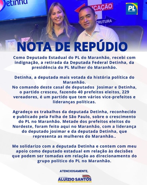 O deputado também ressaltou a importância da liderança de Detinha ao lado de seu marido, o deputado Josimar, na construção de um dos maiores núcleos eleitorais do Nordeste, com metade dos prefeitos eleitos no estado. Ele reafirmou seu apoio à deputada, expressando solidariedade à sua situação e comprometendo-se a se posicionar favoravelmente em relação às futuras decisões políticas do PL no Maranhão.