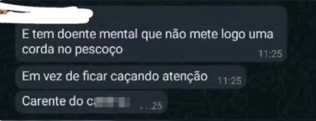 “A minha filha é da mesma turma desse rapaz e em uma divergência por conta de horários de professores, ele começou a desferir palavras de ódio e incitar ao suicídio, falando para ela ‘colocar uma corda no pescoço’. O que mais assustador é que ele sabia da condição da minha filha e sabia que ela tinha atentado contra a própria vida”, conta Juliana.