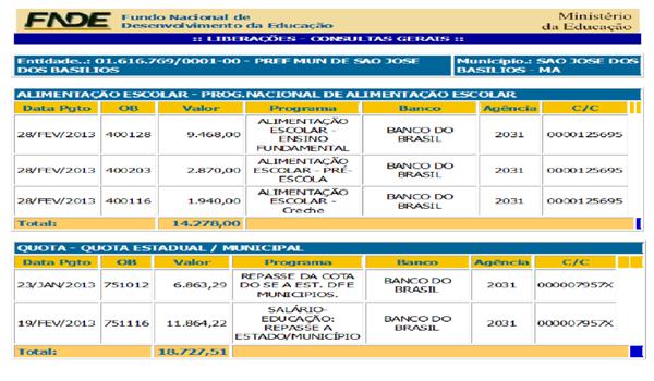 Em pesquisa realizada no Mimistério da Educação, foi constatado que São José dos Basilios recebeu verbas para suprir a necessidade dos alunos com a merenda escolar. Confira abaixo: