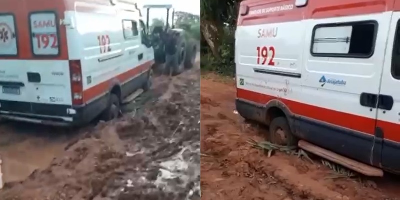 Ao se deslocar para atender a vítima, a ambulância não conseguiu chegar à localidade pois ao passar pela lama da estrada vicinal ficou atolada.