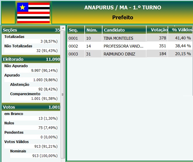 Anapurus: Tina Monteles lidera com 41,40%, professoa Vanderly 38,44% 07/10/2012 | PÁGINA PRINCIPAL, Notícias Navegação de Post Edivaldo Holanda Júnior ultrapassa Castelo; acompanhe aquiBelezinha dispara em Chapadinha; acompanhe as apurações aqui