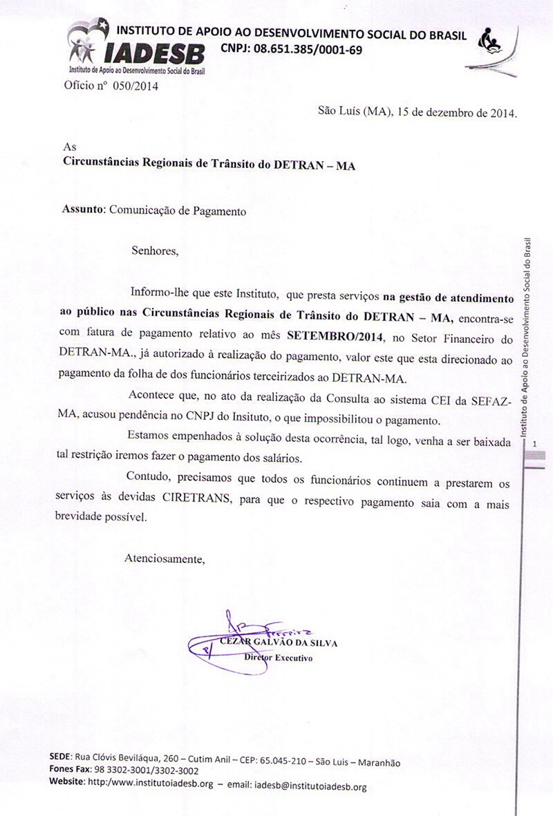 A Direção Geral do Detran-MA informa que paga seus servidores e funcionários em dia tanto na capital, quanto no interior. Infelizmente o Instituto de Apoio ao Desenvolvimento Social do Brasil IADESB que é responsável pelos terceirizados que prestam serviço nas CIRETRANs estão com problemas com certidões o que impede o pagamento do DETRAN ao IADESB conforme oficio 050/2014 já encaminhado aos funcionários.