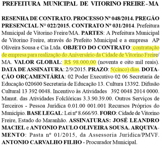 A exemplo da cidade de Vitorino Freire, que comemorará 64 anos de emancipação política e gastará exatos R$ 98.000,00 com as festividades. A beneficiada será a empresa AP Oliveira Sousa e Cia Ltda, que durante cinco dias fará valer a pena o investimento.