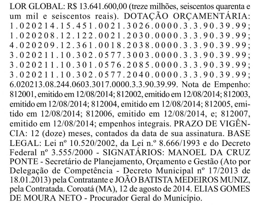 Ela acaba de contratar em Coroatá a Cooperativa Maranhense de Trabalho e Prestação de Serviços (COOPMAR), pelo valor simbólico de R$ 13.64 1.600,00 (treze milhões, seiscentos e quarenta e um mil e seiscentos reais) para executar serviços auxiliares operacionais e apoio administrativo em caráter complementar ao município.
