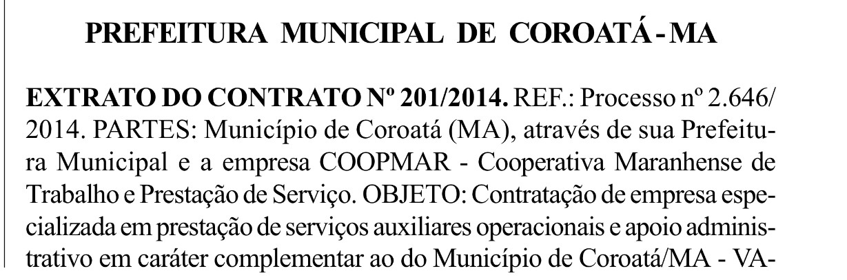 Ela acaba de contratar em Coroatá a Cooperativa Maranhense de Trabalho e Prestação de Serviços (COOPMAR), pelo valor simbólico de R$ 13.64 1.600,00 (treze milhões, seiscentos e quarenta e um mil e seiscentos reais) para executar serviços auxiliares operacionais e apoio administrativo em caráter complementar ao município.