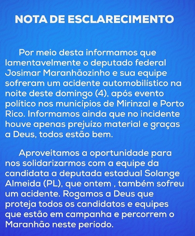 Na noite de domingo (4), o deputado federal e candidato a reeleição, Josimar de Maranhãozinho (PL), sofreu um grave acidente após ato de campanha em Porto Rico.