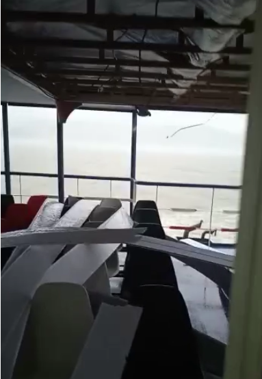Vídeos gravados por passageiros dentro da embarcação mostram o momento que parte do forro cai devido a forte chuva que atingia a Baía de São Marcos.