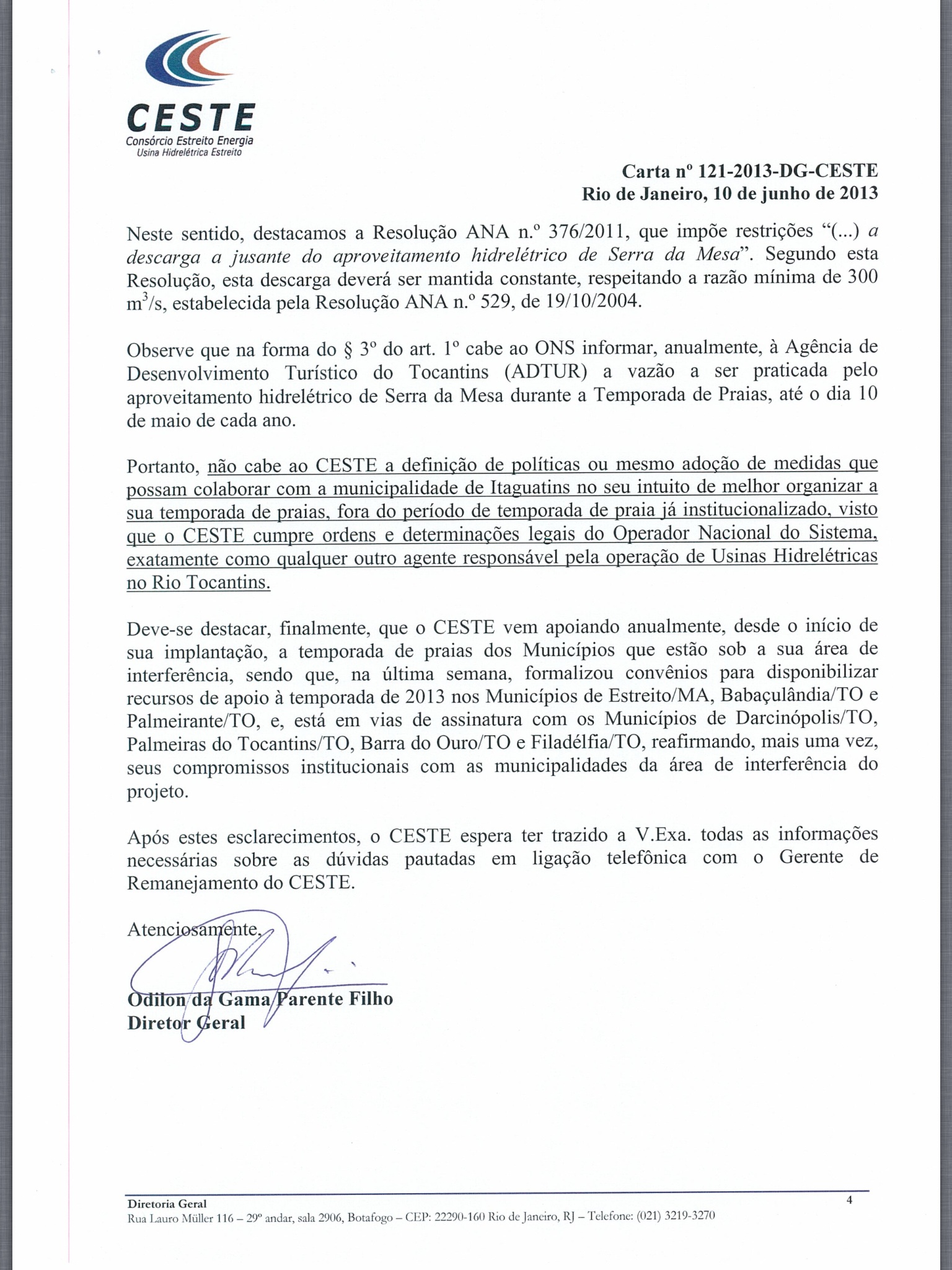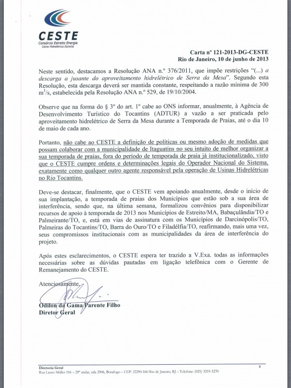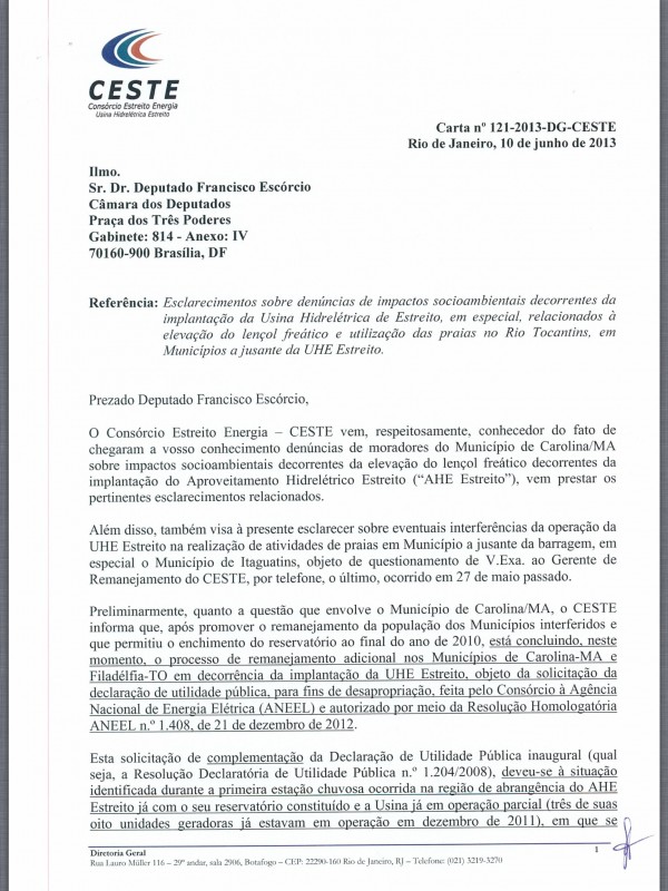 Após pronunciamento duro do deputado federal Francisco Escórcio (PMDB-MA) sobre os impactos socioambientais decorrentes da implantação da Usina Hidrelétrica de Estreito, o consórcio manifestou-se através de carta nº 121-2013-DG (veja documento na íntegra abaixo) trazendo esclarecimentos a respeito das denúncias.