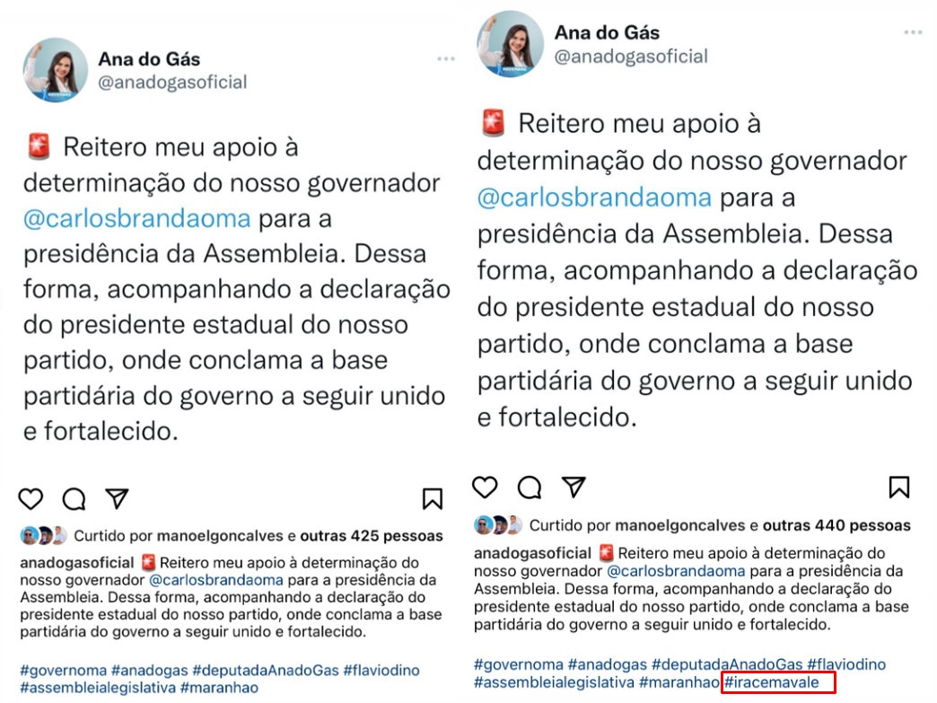 Na segunda-feira (12), a parlamentar publicou em suas redes sociais que seguiria as orientações de Brandão e mencionou a hastag em nome de Iracema, mas excluiu em menos de 24 horas (reveja aqui).