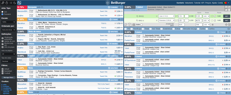 Atualmente, o BetBurger é considerado um dos melhores scanners de arbitragem do mercado. Inúmeras avaliações positivas de seus usuários confirmam sua eficácia. O serviço coleta dados de 440 casas de apostas em 48 esportes, tanto no modo ao vivo quanto no pré-jogo, garantindo que os usuários sempre tenham uma rica seleção de oportunidades de arbitragem para trabalhar.