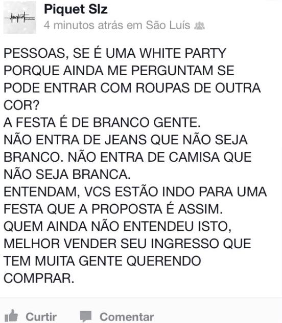 “Pessoas, se é uma white party porque ainda me perguntam se pode entrar com roupas de outra cor? Não entra de jeans que não seja branco. Não entra de camisa que não seja branco. Quem ainda não entendeu isto, melhor vender seu ingresso que tem muita gente querendo comprar”, disse o promoter.
