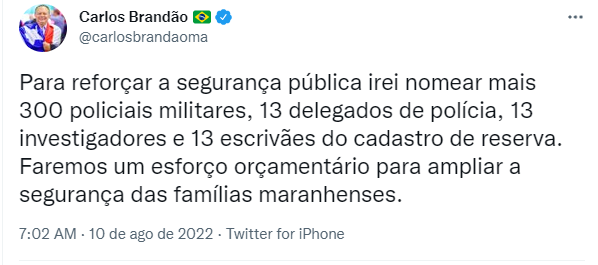 “Faremos um esforço orçamentário para ampliar a segurança das famílias maranhenses”, escreveu.