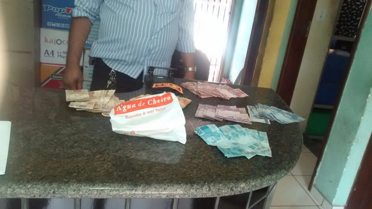 Quando a polícia militar se preparava para trazer a moto abandonada pelo assaltantes, recebeu uma ligação do senhor identificado por Thiago Santos Carvalho informando que ele havia encontrado a quantia de 3.643,00 reais que tinha caído dos assaltantes no momento da fuga.