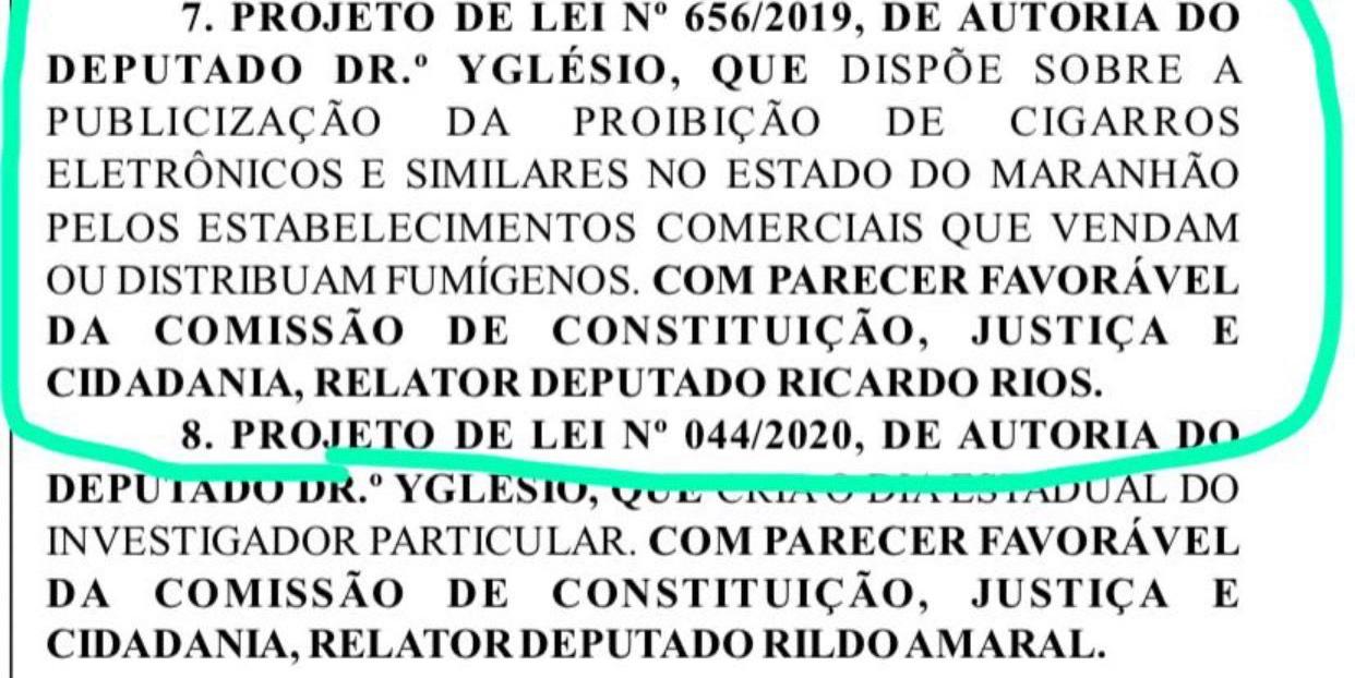 A Assembleia Legislativa do Maranhão aprovou na terça-feira (22) um Projeto de Lei de autoria do deputado estadual licenciado e candidato a prefeito de São Luís, Yglésio Moysés (PROS), que visa a proibição da venda de cigarro eletrônico no Maranhão.