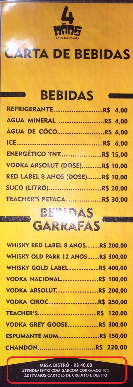 É o que está registrado no cardápio de uma rede de entretenimentos em São Luís, que promoveu o show de Henrique & Juliano e Aviões do Forró. O Procon foi acionado, mas afirmou que não pode interferir na prática da empresa por se tratar de livre iniciativa.