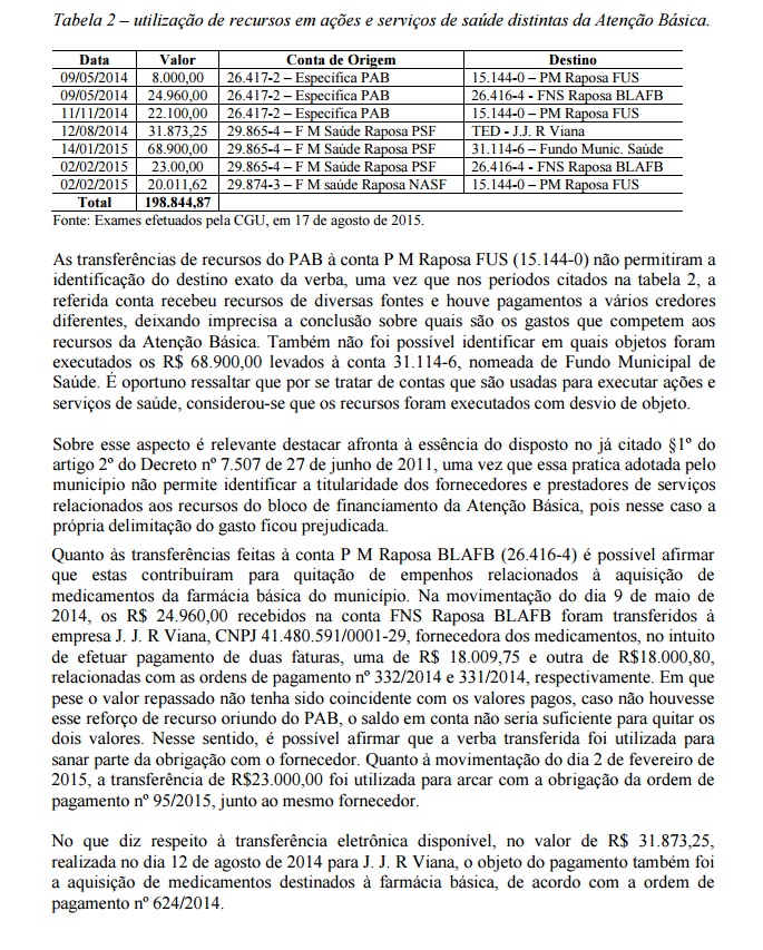 Os trabalhos foram executados no período de 17 a 21 de agosto de 2015 e avaliaram, em especial, a aplicação das verbas federais destinadas ao programa Bloco da Atenção Básica, em Raposa.