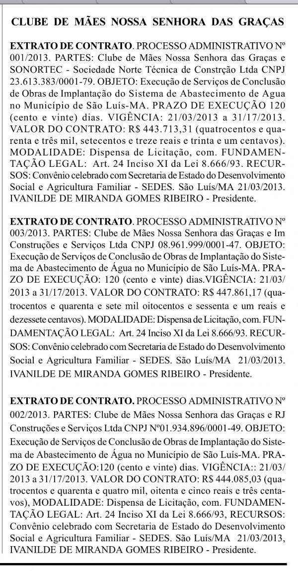 Os convênios celebrados entre a pasta de Fialho e associações foi denunciado no Blog do Neto Ferreira que empresas SONOTEC e I.M. Construcoes e Serviços Ltda., estariam sendo beneficiadas nas contratações (reveja aqui). Confira abaixo os contratos com dispensa de licitação.