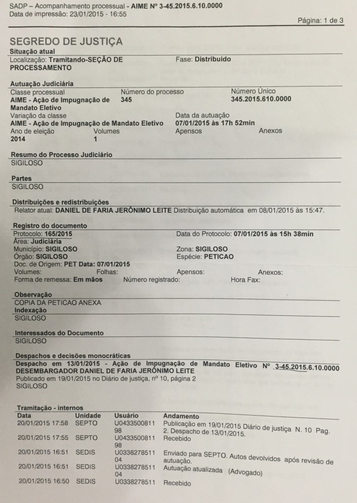 Na Corte Eleitoral tramita em segredo de justiça uma Ação de Impugnação de Mandato Eletivo (AIME), que tem como relator o desembargador Daniel Leite.