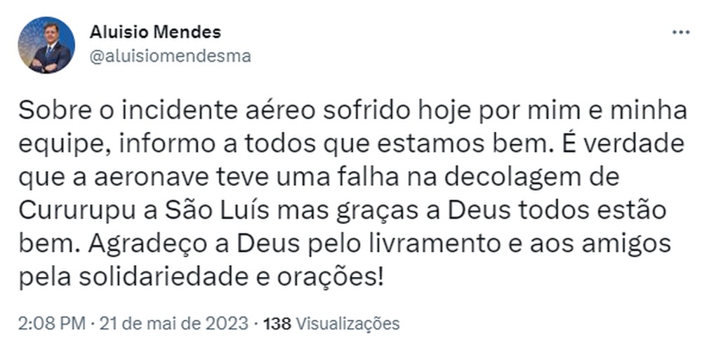 Nas redes sociais, Aluísio Mendes disse que a aeronave teve uma falha na decolagem de Cururupu a São Luís, mas que todos os ocupantes estão bem.
