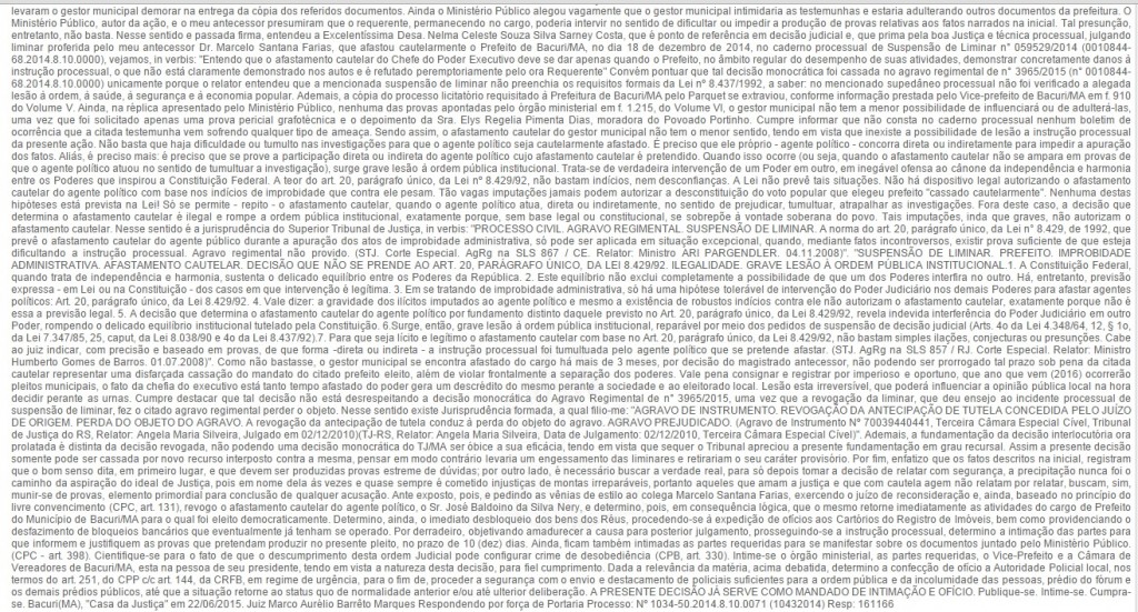 O juiz da comarca de São Mateus, Marco Aurélio Barrêto Marques, que também responde pela Comarca de Bacuri, deu a decisão favorável a Baldoino. “Baseado no princípio do livre convencimento (CPC, art. 131), revogo o afastamento cautelar do agente político, o Sr. José Baldoino da Silva Nery, e determino, pois, em consequência lógica, que o mesmo retorne imediatamente as atividades do cargo de Prefeito do Município de Bacuri/MA para o qual foi eleito democraticamente”, despachou.