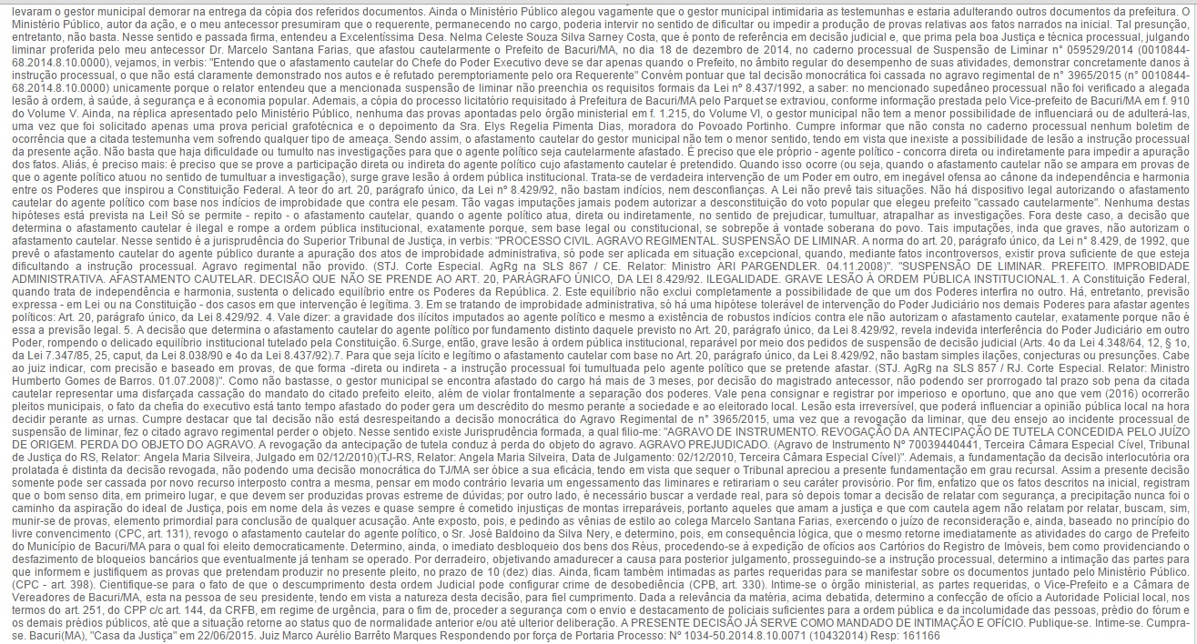 O juiz da comarca de São Mateus, Marco Aurélio Barrêto Marques, que também responde pela Comarca de Bacuri, deu a decisão favorável a Baldoino. “Baseado no princípio do livre convencimento (CPC, art. 131), revogo o afastamento cautelar do agente político, o Sr. José Baldoino da Silva Nery, e determino, pois, em consequência lógica, que o mesmo retorne imediatamente as atividades do cargo de Prefeito do Município de Bacuri/MA para o qual foi eleito democraticamente”, despachou.