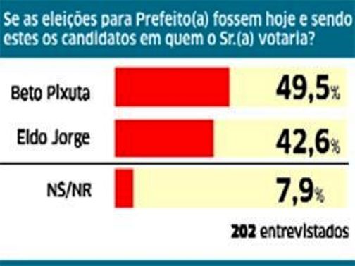 Na espontânea, Beto Pixuta, obtém 51% do eleitorado daquele município. Já Eldo Jorge aparece com 28,2%, e não sabem ou na quiseram responder 20,8%
