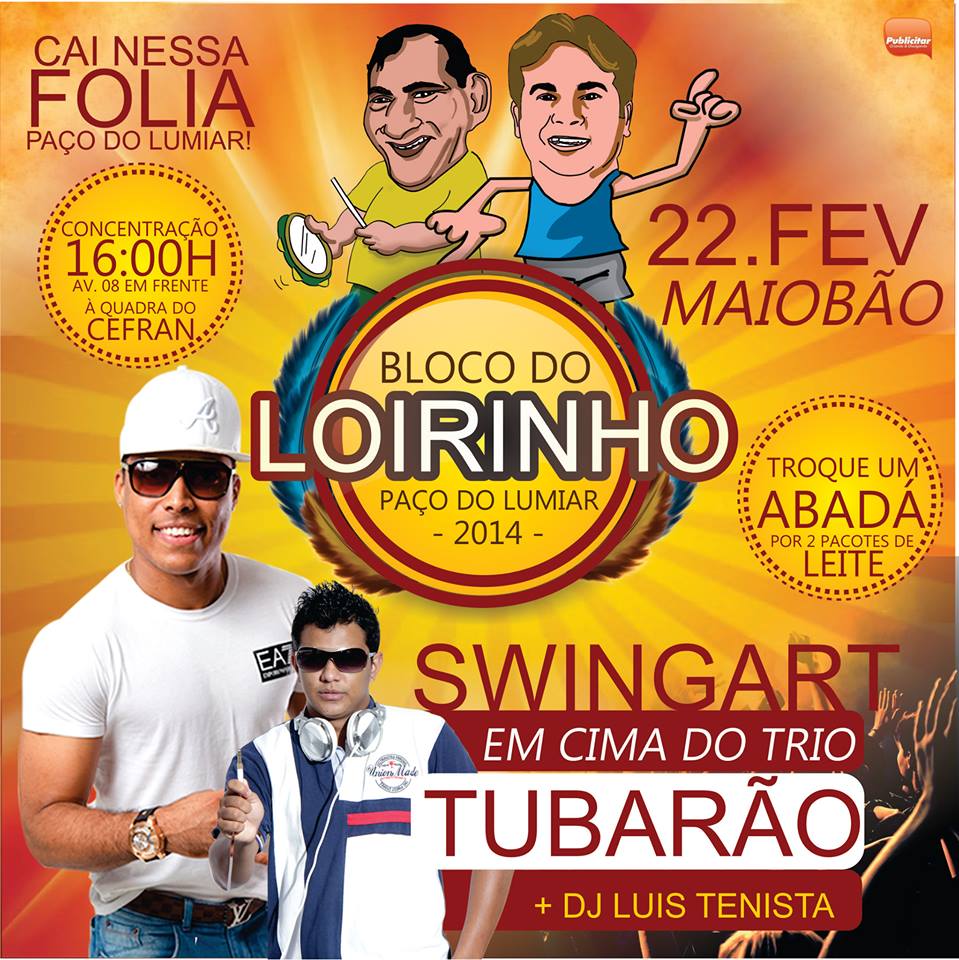 Para animar o arrastão do “Bloco do Loirinho” deste ano, estão confirmadas as bandas Swingart SL e Dj Tenista, no Trio Tubarão. A concentração acontece a partir das 16h, na Avenida 08, próximo à quadra da escola Cefran, percorrendo as avenidas 04, 13 e encerrando na 15, no Viva Maiobão.