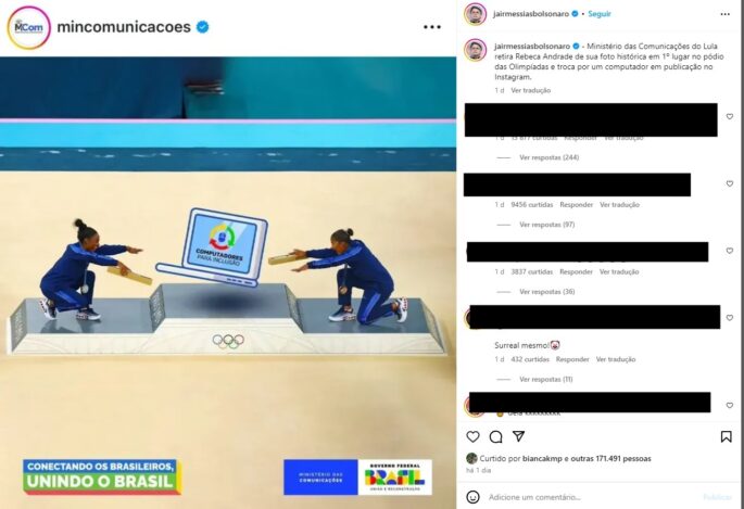 “Ministério das Comunicações do [presidente] Lula retira Rebeca Andrade de sua foto histórica em 1º lugar no pódio das Olimpíadas e troca por um computador em publicação no Instagram”, escreveu Bolsonaro.