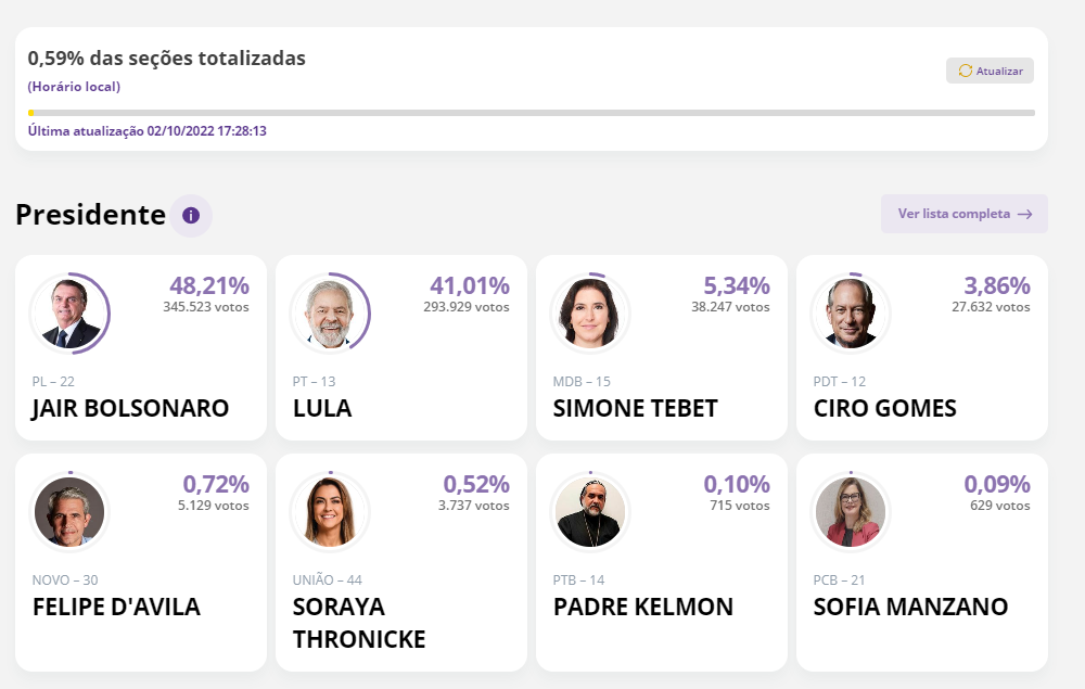 Bolsonaro segue liderando a disputa presidencial 02/10/2022 | PÁGINA PRINCIPAL, Notícias Com 0,59% das seções totalizadas, Bolsonaro está com 48,21% dos votos contra 41,01%. Navegação de Post Bolsonaro com 47,61% e Lula com 41,36%Bolsonaro com 48,17% e Lula com 41,15%