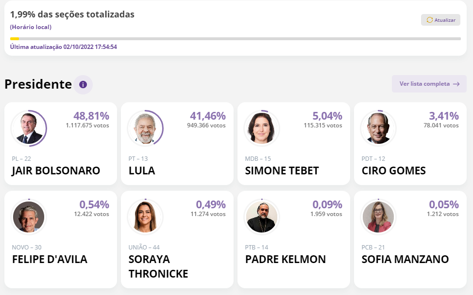 Bolsonaro segue na liderança da corrida presidencial 02/10/202202/10/2022 | PÁGINA PRINCIPAL, Notícias Navegação de Post Flávio Dino na liderança para o SenadoBrandão com 55,62% seguido de Lahésio com 24,68%