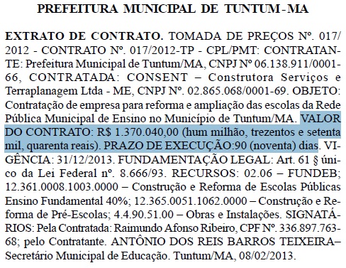 No Diário Oficial do dia 19 do mês de fevereiro deste ano, a prefeitura de Cleomar Tema realizou um contrato de R$ 1.370.040,00 com a Consent para reforma e ampliação das escolas da Rede Pública Municipal de Ensino. A empresa terá o prazo de 90 dias para executar o serviço. É claro, se realmente for executar.