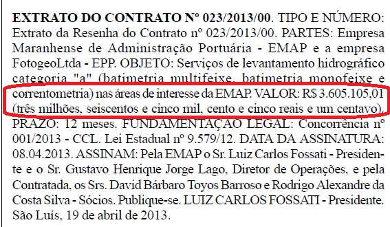 A Empresa Maranhense de Administração Portuária (Emap) anda desafiando os orgãos fiscalizadores após celebrar de forma escandalosa contratou superfaturado com a empresa FotogeoLtda. A empresa abocanhou contrato no valor de R$ 3.605.105,01 (três milhões, seiscentos e cinco mil, cento e cinco reais e um centavo), para trabalhar com batimetria monofeixe, correntometria e Batimetria miltifeixe.