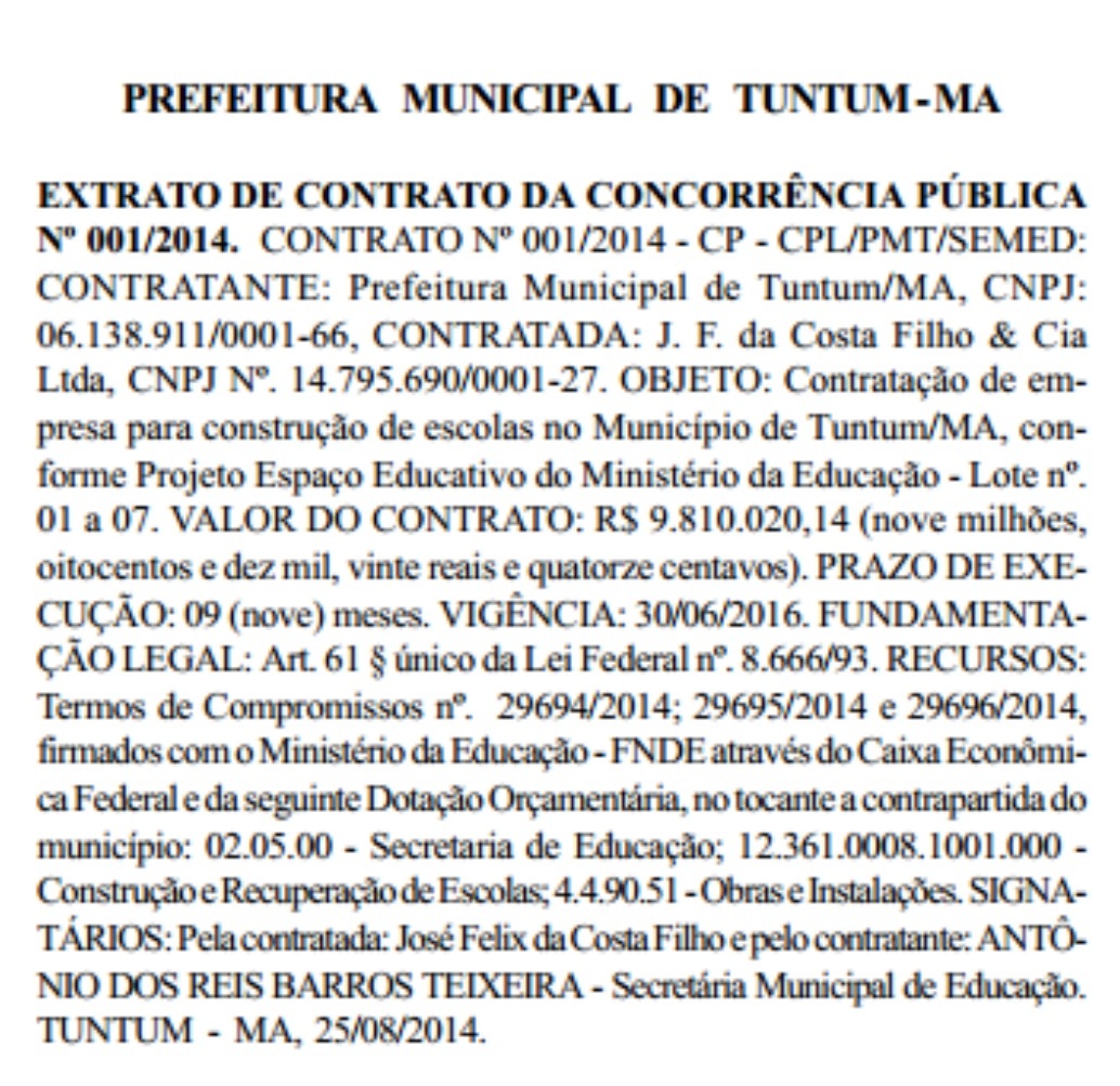 O prefeito Cleomar Tema, desta vez ultrapassou os limites da moralidade e impessoalidade contratando a Empresa J.F da Costa Filho & Cia Ltda, que receberá R$ 9.810.020,14 (nove milhões, oitocentos e dez mil, 20 reais e quatorze centavos), para construção de escola no município de Tuntum.