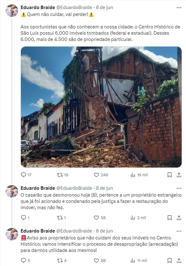 “Aos oportunistas que não conhecem a nossa cidade: o Centro Histórico de São Luís possui 6.000 imóveis tombados (federal e estadual). Desses 6.000, mais de 4.500 são de propriedade particular. O casarão que desmoronou hoje (8), pertence a um proprietário estrangeiro que já foi acionado e condenado pela justiça a fazer a restauração do imóvel, mas não fez”, escreveu.